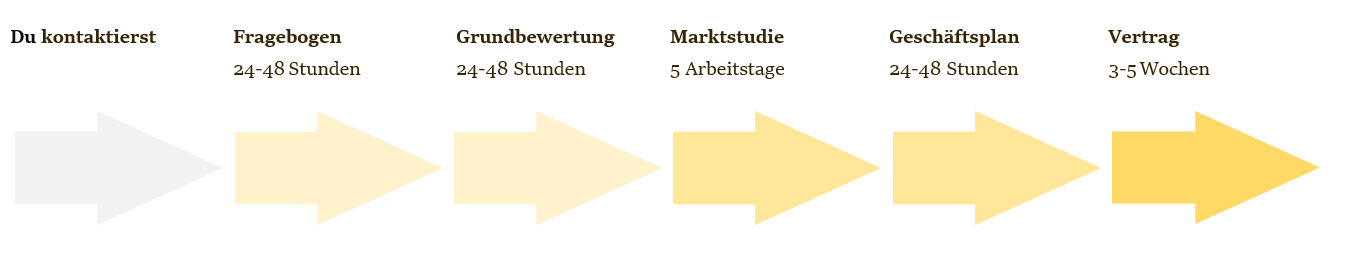 Für den gesamten Prozess planen wir von Anfang bis Ende maximal 2 Monate. Dabei gehen wir sicher, dass die erforderliche Due Dilligence zügig durchgeführt wird ohne das die Qualität unter Zeitdruck leidet.